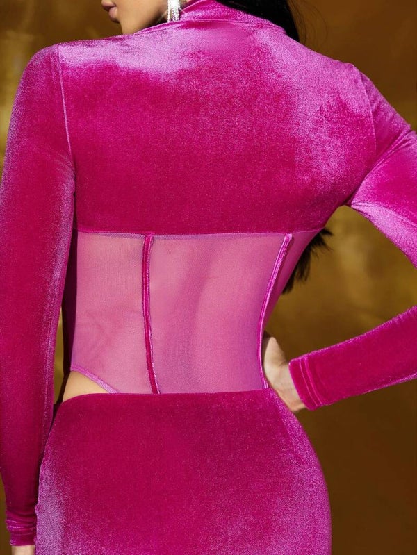 Mega Sexy Body mit Stehkragen, Kontrast Netzstoff, Samt